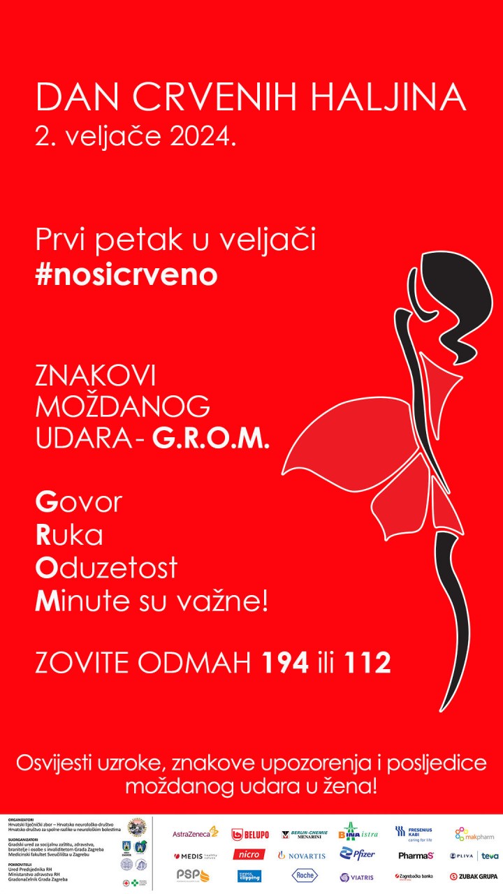 Ove godine pod pokroviteljstvom gradonačelnika Grada Zagreba, Hrvatski liječnički zbor - Hrvatsko neurološko društvo u suorganizaciji s Gradskim uredom za socijalnu zaštitu, zdravstvo, branitelje i osobe s invaliditetom i u 2024. godini organizira šestu po redu javnozdravstveno - edukativnu kampanju „Dan crvenih haljina". Slične kampanje koje se redovito održavaju u Europi i SAD-u, izazvale su interes stručnjaka i javnosti, a progovaraju o karakteristikama i specifičnostima moždanog udara u žena, teškoćama u liječenju i prevenciji moždanog udara kod ženske populacije te vrlo čestom zanemarivanju te bolesti.
